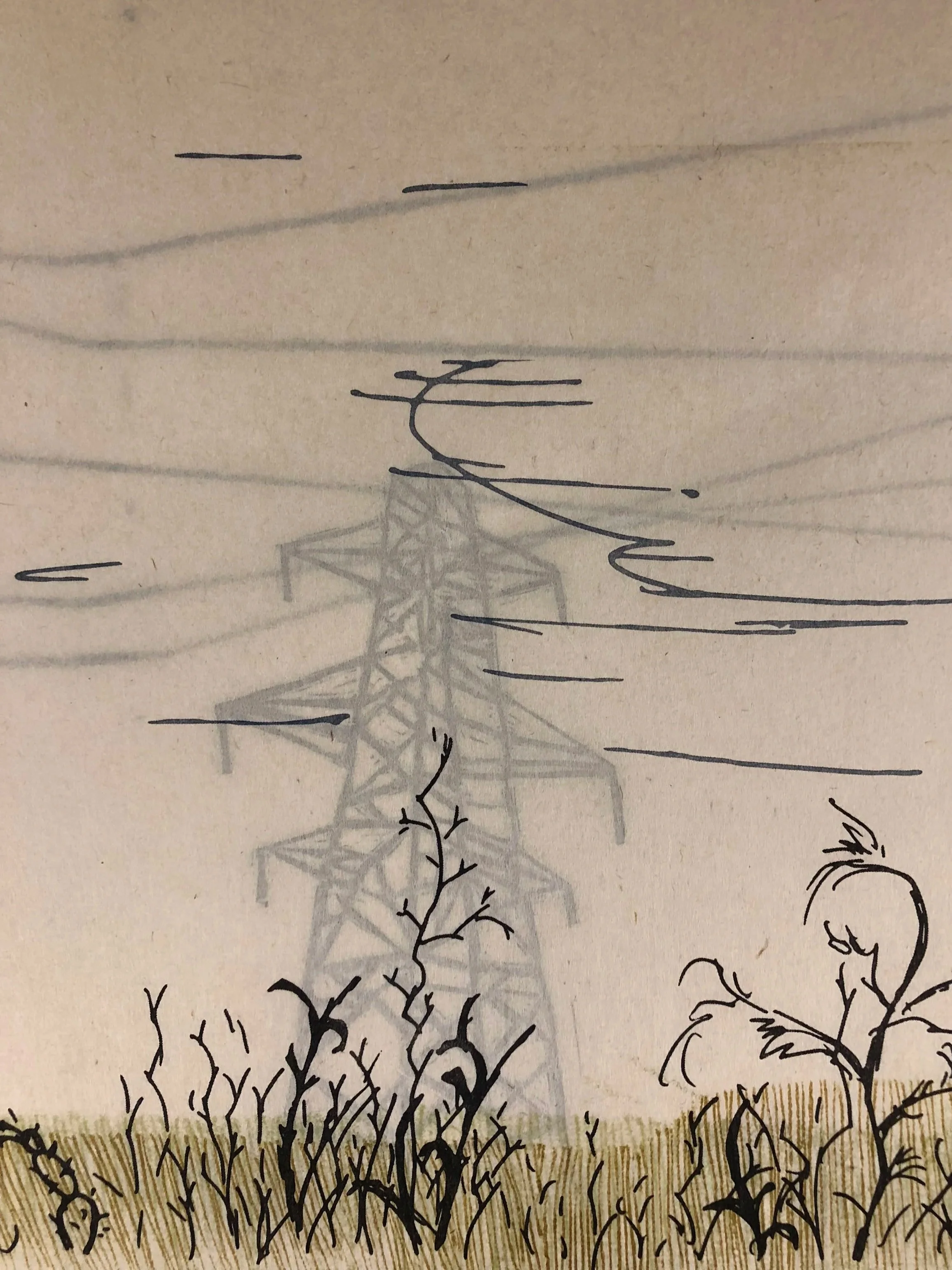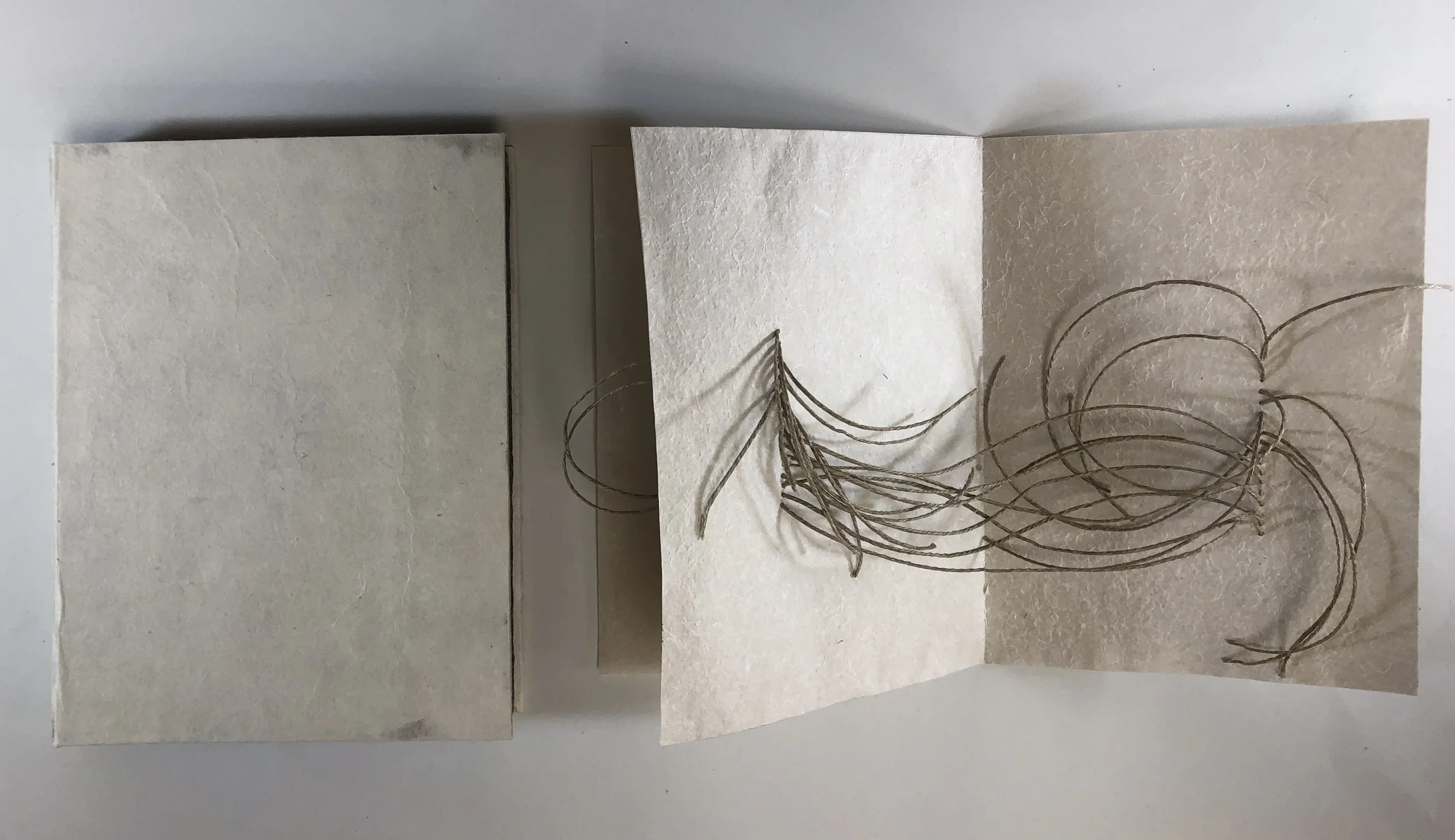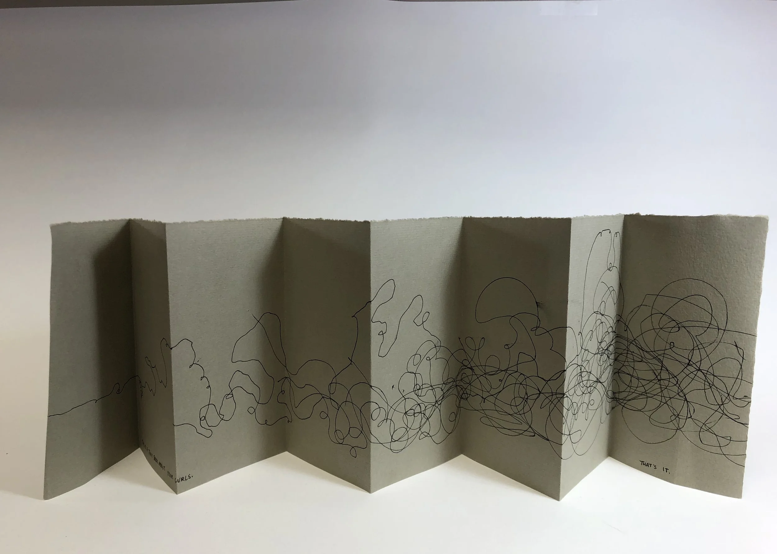 An accordion folded in summer of 2019 featuring a line drawing on handmade linen paper with a half slipcase of pigmented cotton paper made by Kasey Grealis.