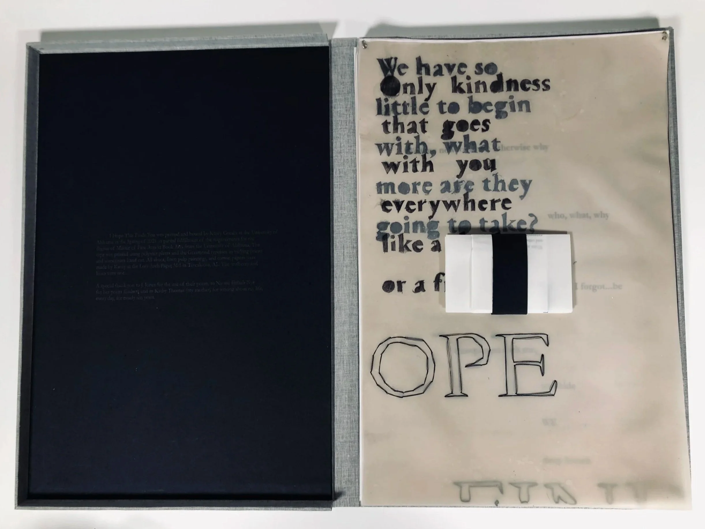 “I Hope This Finds You” was printed and bound by Kasey Grealis at The University of Alabama in the Spring of 2021 in partial fulfillment of the requirements for the degree of Master of Fine Arts in Book Arts from UA. The typeface is Garamond in varying points and sometimes hand cut. All abaca, linen pulp paintings, and cotton papers were made by Kasey at the Lost Arch Paper Mill in Tuscaloosa, AL. The Mulberry and kozo were not…