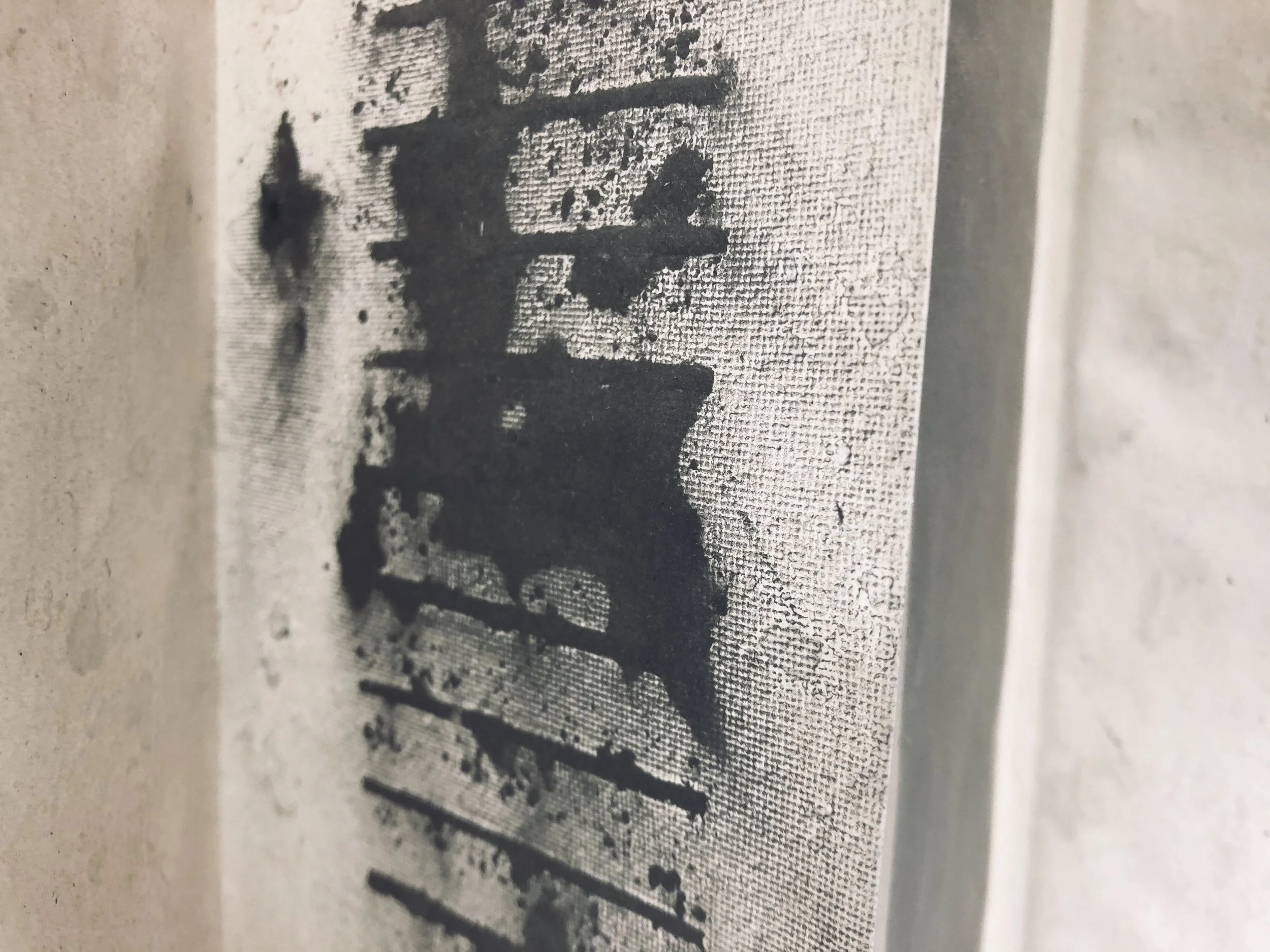 A celebration of couching. Charcoal, abaca, and black pigmented linen were all handmade by Kasey Grealis. The cover is silk wrapped board.