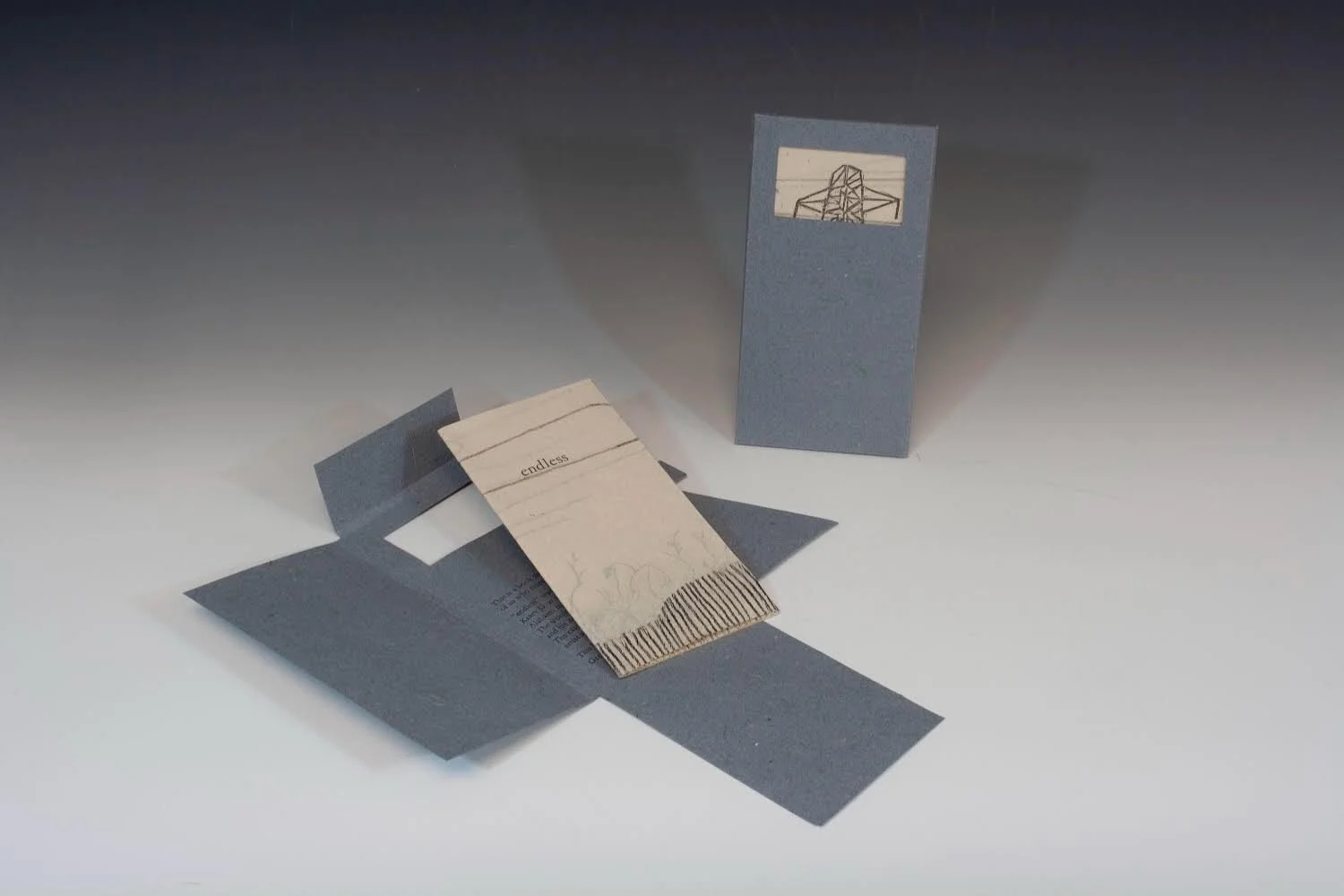 “endless” was printed by Kasey G. at the University of Alabama in the Spring of 2019. The words belong to Tim Dorsey and his novel, Florida Roadkill. The case is cotton paper made by the artist and the single page book is Thai kozo.